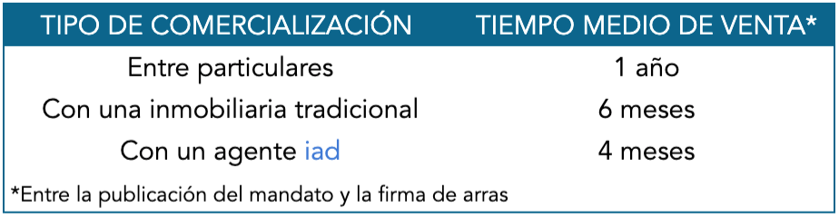 Según un estudio llevado a cabo por el portal inmobiliario Fotocasa el tiempo medio de venta de un piso en España está entre los 6 meses a 1 año. En iad, este tiempo es de 3,7 meses de media*, según el último estudio del mes de Noviembre 2020 que incluye todas las operaciones a nivel nacional en los últimos 5 meses.